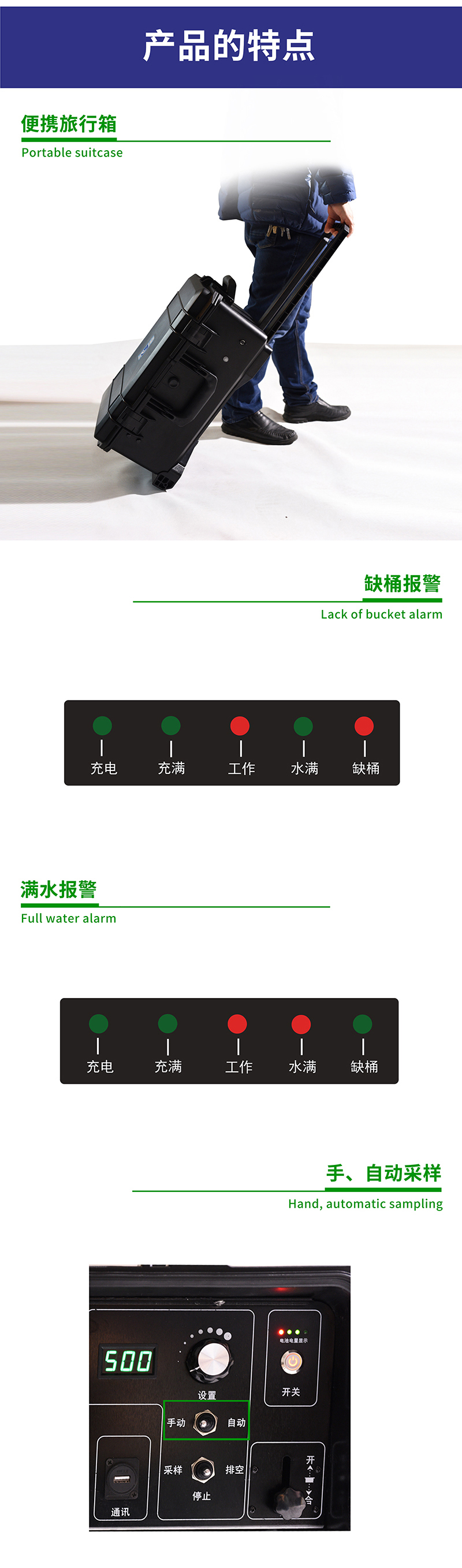 5. 桶滿(mǎn)自動(dòng)檢測(cè),非接觸式檢測(cè)方式,當(dāng)采樣桶中水滿(mǎn)時(shí)自動(dòng)停止采樣,并聲光報(bào)警提示用戶(hù);