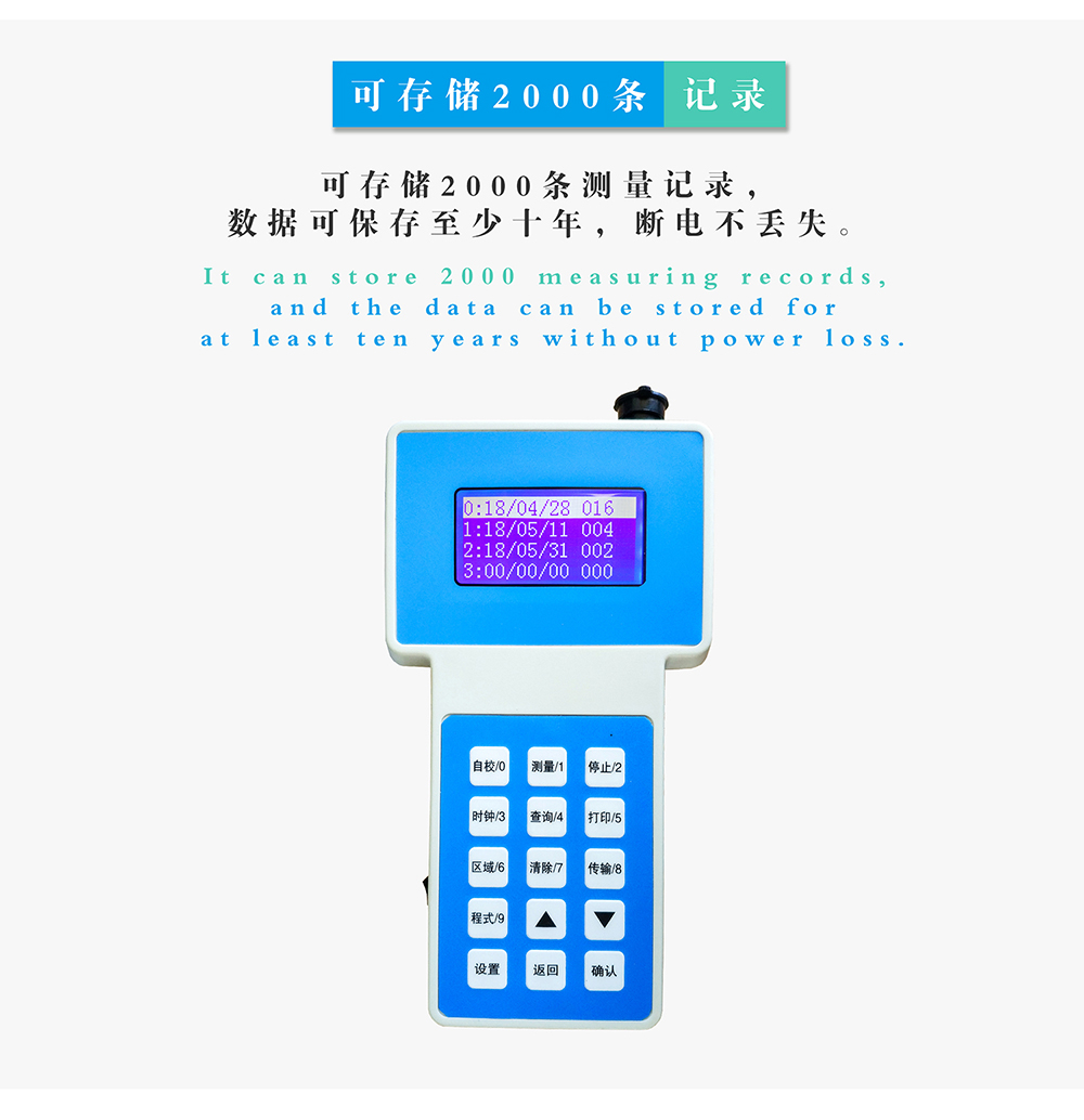 7.數據存儲容量:存儲區域10個,可存儲1000條測量記錄,數據可保存至少十年,斷電不丟失;