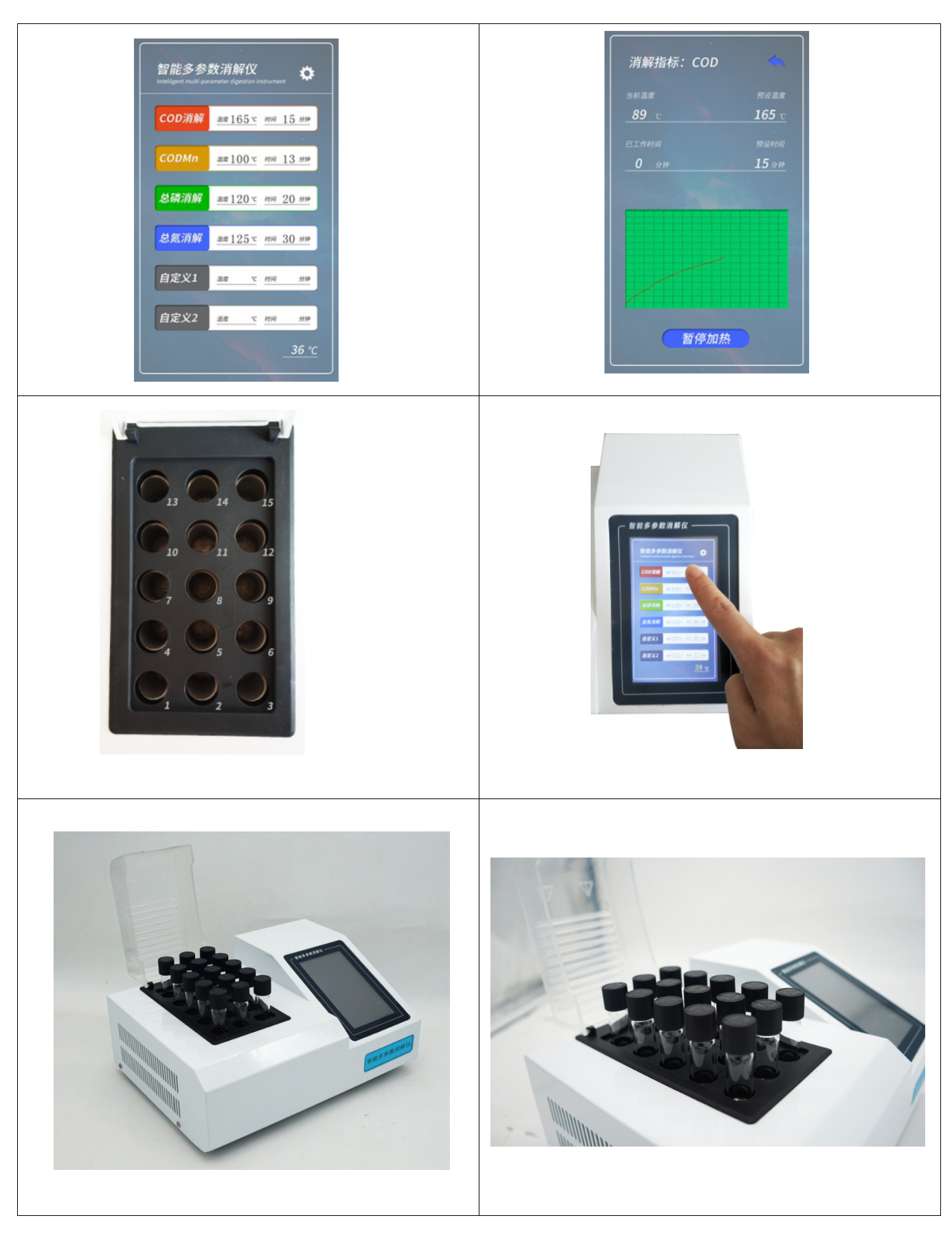 2.一鍵式啟動消解,儀器預設常用消解指標參數(如COD、總磷、總氮等),一鍵選擇相應指標進入消解操作。