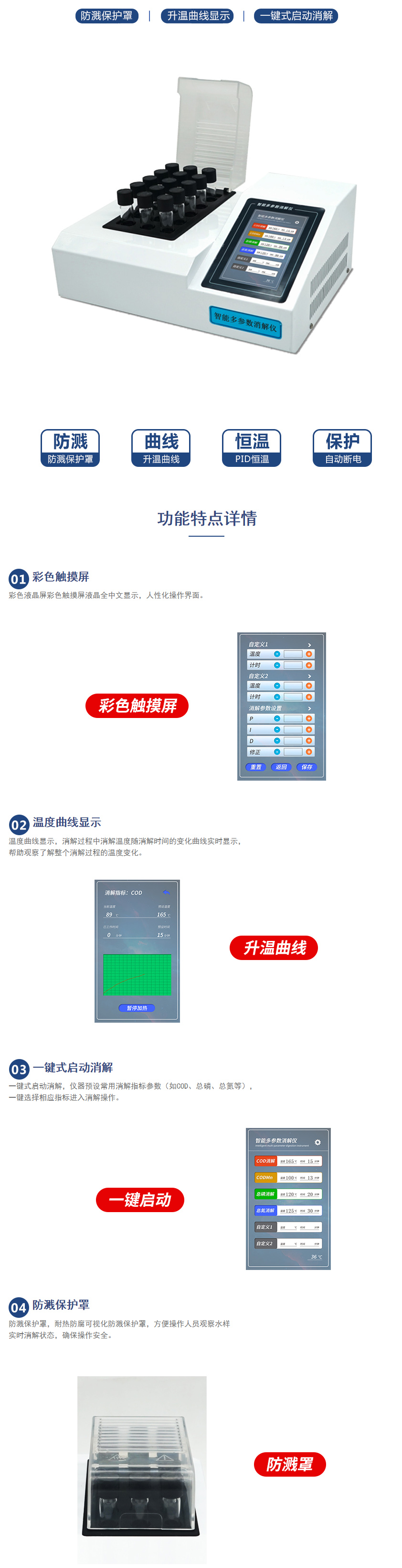 3.防濺保護罩,耐熱防腐可視化防濺保護罩,方便操作人員觀察水樣實時消解狀態,確保操作安全。