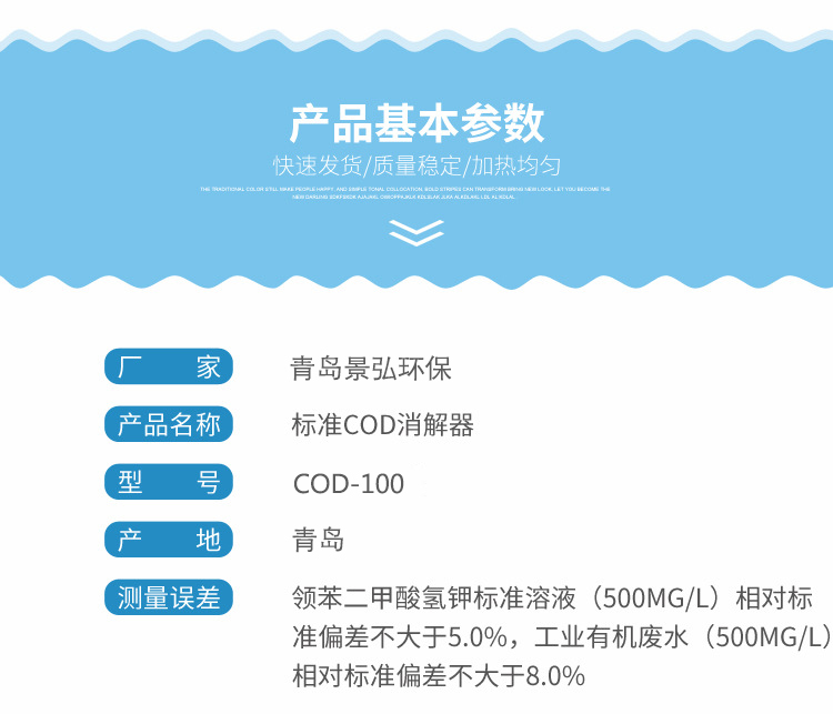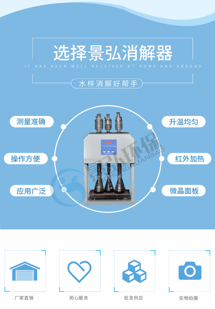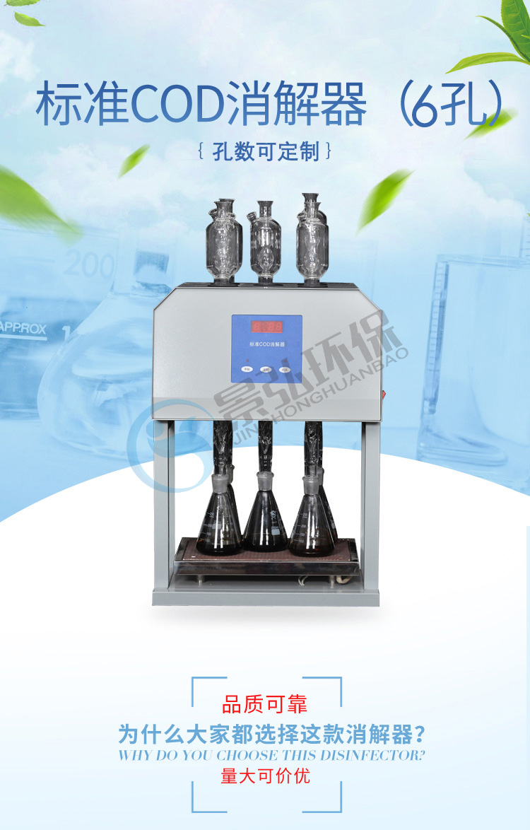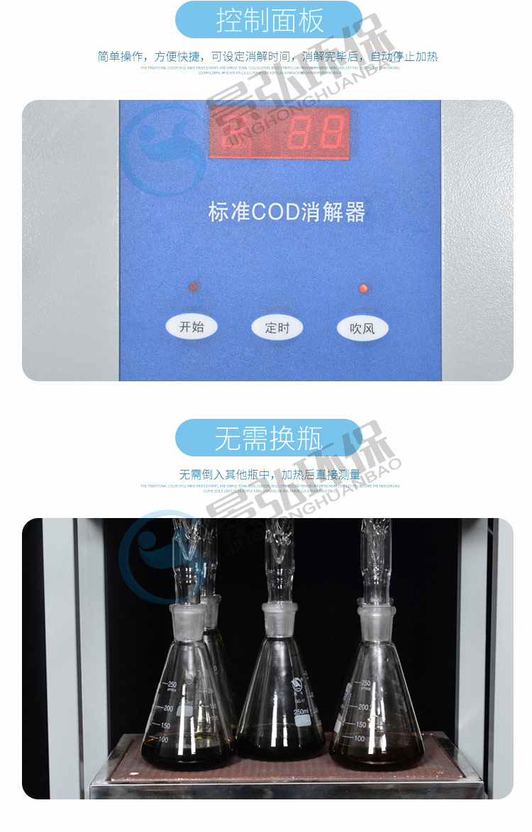 儀器的化學溶液配制、操作和COD的計算遵照GB11914-89,低于50mg/L的COD水樣可通過稀釋滴定劑和氧化劑來提高精確度,高于1000mg/L的COD水樣,可通過水樣的比例稀釋來完成測定。