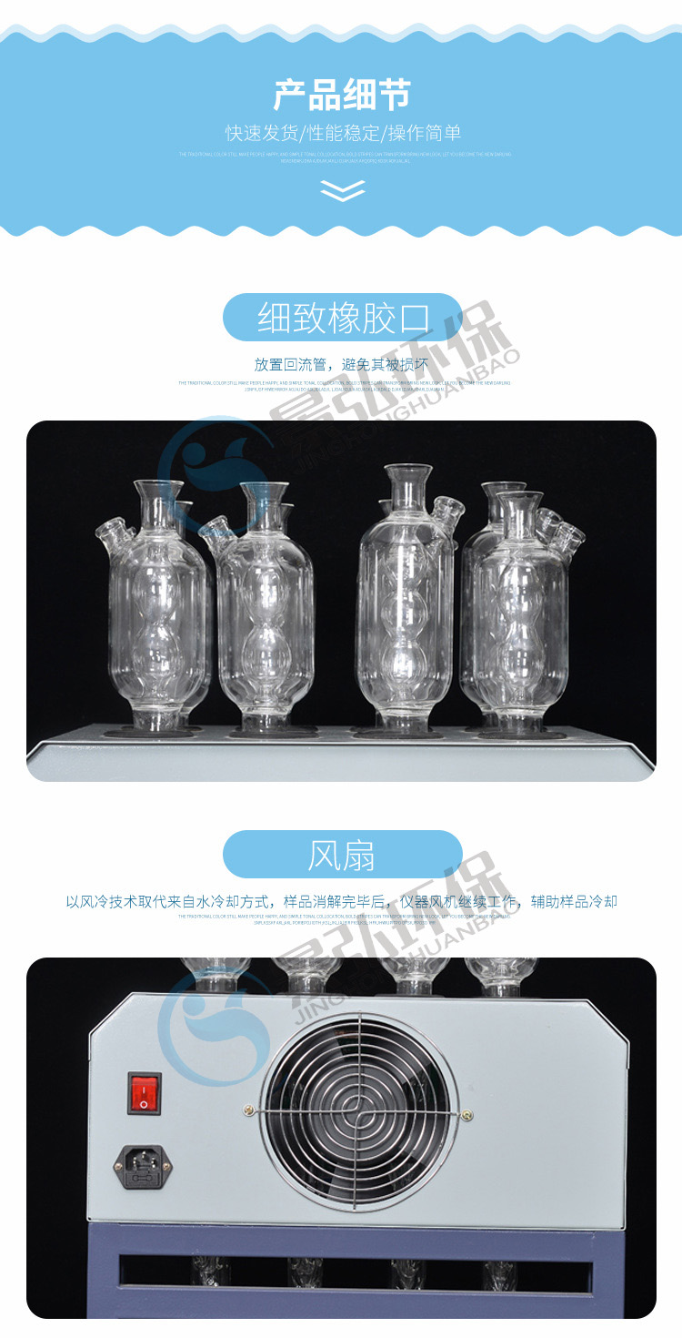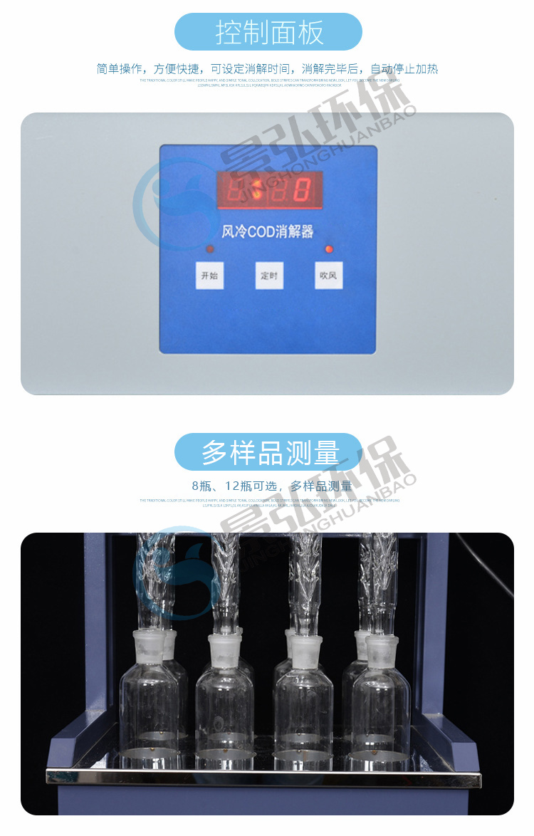 風冷COD消解器采用微機技術進行定時控制加熱電爐,可對8個、12個消解錐形回流裝置同時進行加熱。達到節能、減低電力負荷、提高效率的目的。儀器采用玻璃毛刺回流管代替球形回流管,并以風冷技術取代自來水冷卻方式,既可以節水又能使儀器規范化,同時使儀器使用更放心。